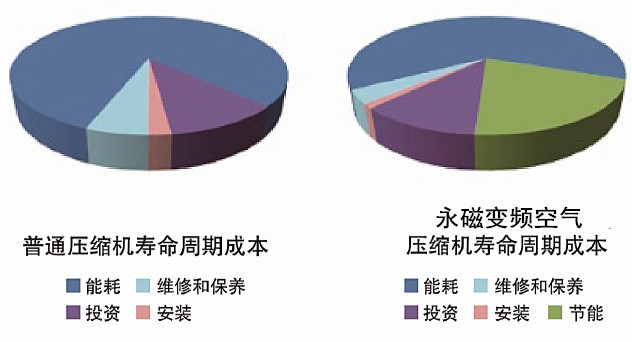 永磁变频空压机可以精确的满足用户的空气需求。当用户的用气量降低时,排气量相应地减少,同时能耗也按比例下降。通过先进的变频技术,大大的减少了空压机的卸载,使能耗大大下降。永磁变频空压机可跟踪空气需求量的变化自动调节电机转速,平均节能可达50%。